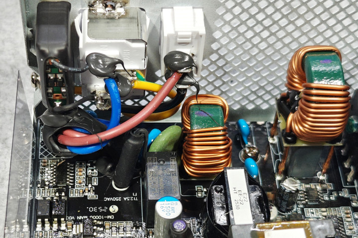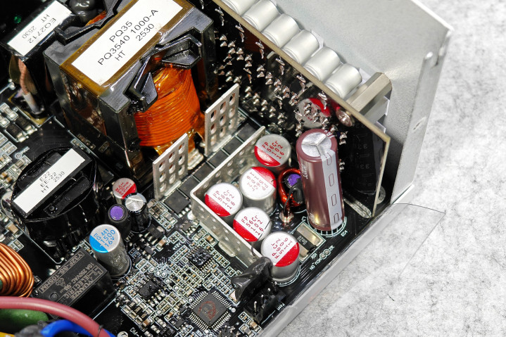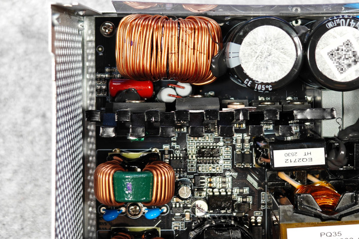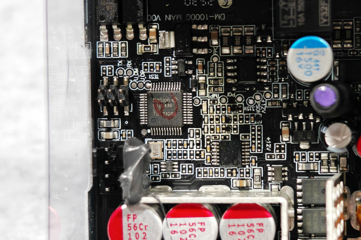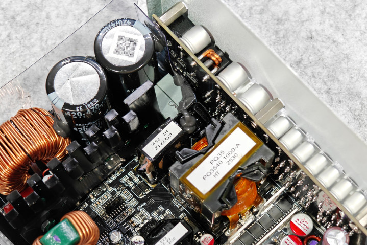 电源共配备两个来自红宝石的主电容,具体规格为420V/470μF/105℃,并联总容量可达到940μF,对于一款额定输出功率为1000W的电源来说很充足,主电容后方为LLC电路,分别两个谐振电容(灰色),被完全遮挡看不清具体型号,然后就是型号为EQ2712的谐振电感、电流互感器与主变压器,LLC控制器位于PCB的背面,型号为虹冠CM6901。