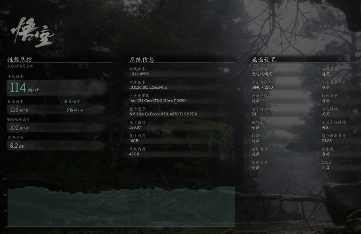 在《黑神话:悟空》游戏中开启DLSS超分辨率采样与帧生成,超采样清晰度设为50,其它画质选项均设为超高,平均帧率为114FPS,最低帧率为96FPS。