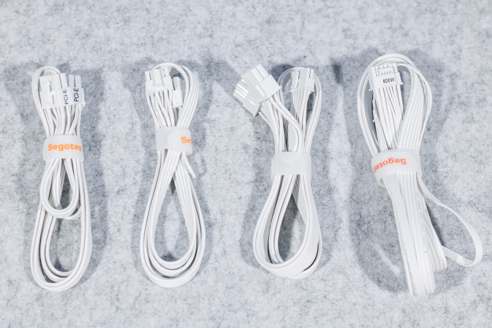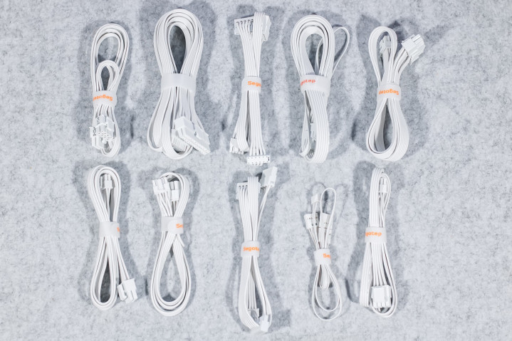 随机附带的线材均为扁平排线,同时有着压纹线的纹理设计,以及压纹线的柔软度,线体与接口均为白色,并附有魔术捆扎带,线材配置方面,一条24Pin主板供电线(600mm)、两条8Pin(4+4)CPU供电线(700mm)、一条8Pin(6+2)PCIe供电线(550mm)、一条8Pin一分二PCIe供电线(500+150mm),一条16Pin(12+4)12V-2X6供电线(600mm),一条16Pin转双8Pin(6+2)PCIe供电线(600mm),两条双SATA+大4Pin供电线(450+150+150mm),一条USB2.0线。