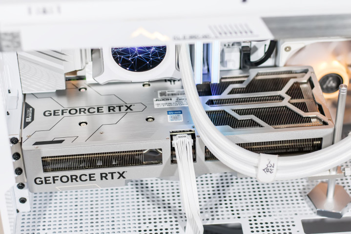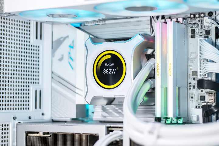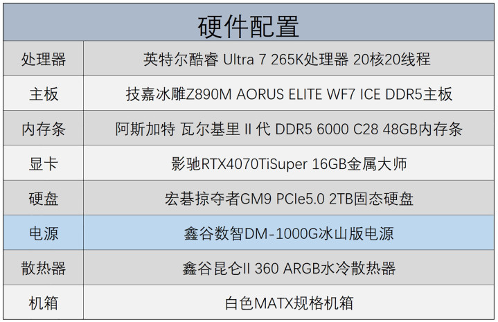 下图是白色海景房主机的装机效果,电源标配的模组线简洁整齐排布美观,可以无需捆扎带或者理线梳,说说详细硬件配置,处理器为Intel Ultra7 265K,主板为技嘉Z890M DDR5冰雕,显卡为影驰RTX4070Ti Super 16GB金属大师,内存条为阿斯加特女武神二代DDR5 6000 C28 48GB内存条,搭配白色外观的MATX机箱与鑫谷昆仑2代360水冷散热器。