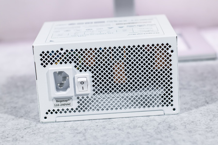 电源的散热风扇支持自动启停功能,根据负载状态或内部温度等多种因素,由系统自动控制风扇的转速,用户也可通过控制软件去调节风扇转速曲线,位于电源的尾部同样采用大面积镂空设计,矩形的格栅较为密集,左侧为220V AC电源输入接口,还配备独立的电源开关。