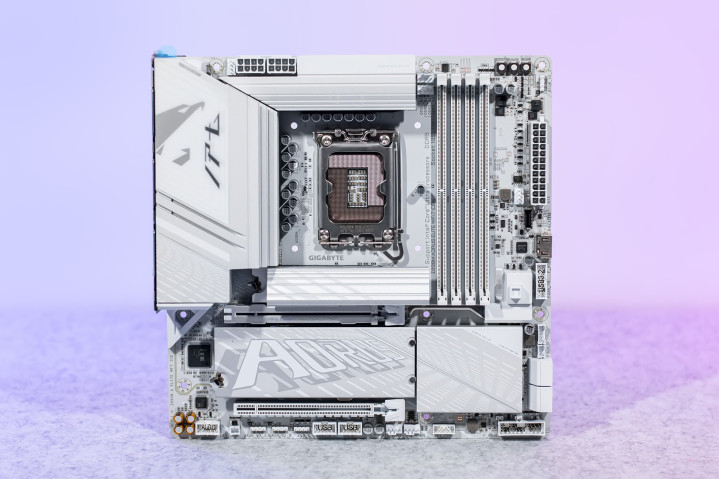 技嘉Z890M DDR5冰雕主板采用MATX尺寸规格,外观方面白得挺彻底,供电接口与内存插槽同为白色,主板采用12+1+2相供电方案设计,其中12相为核心供电,即使面对Ultra9 285K处理器也不虚,装机时需要将USB线缆连接至主板下方的板载USB插针上,才能查看电源实时功率与风扇转速等状态。