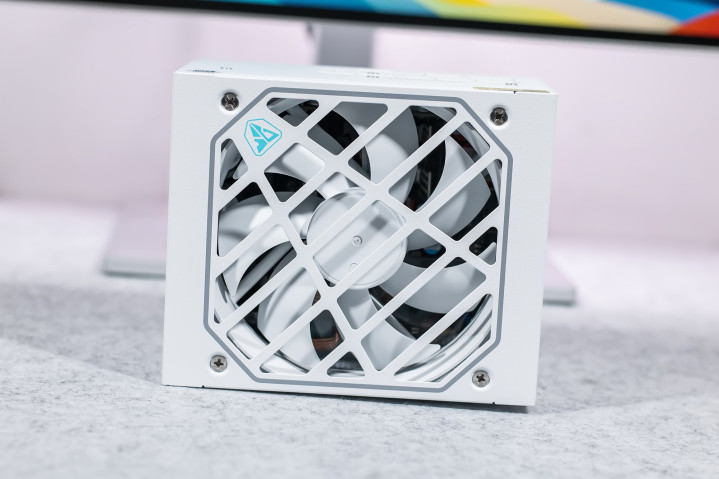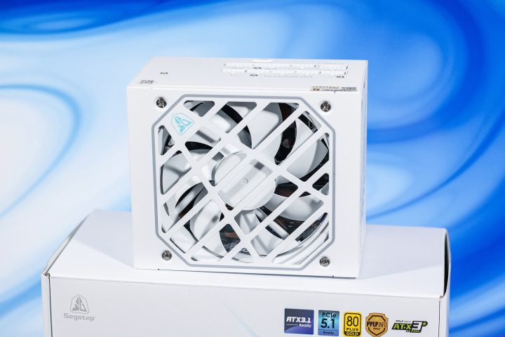 目前电源共提供了黑白两种配色版本可选,由于本次组装的主机为白色海景房外观,因此选择白色外观的冰山版,电源外壳与模组线均为白色,顶盖采用大面积镂空设计,相对较疏的网格则在进风方面具有优势,在左上方印了鑫谷的徽标,通过格栅可见内部白色的散热风扇。