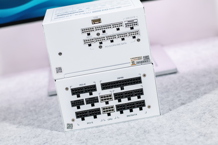 鑫谷数智DM-1000G冰山版电源采用全模组设计,背部为模组输出接口,在供电输出接口都印有相应标识,从上到下分别为USB数据接口,一组MB16+MB12主板供电接口,一组原生12V-2X6供电接口,然后六组PCIe/CPU/IDE/SATA设备供电接口,通用接口支持盲插。