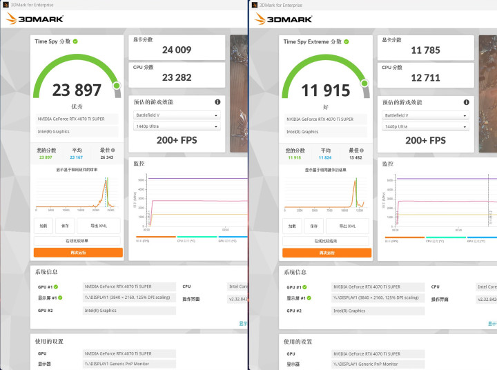 硬件性能测试部分,3DMark基准测试软件中的Time Spy项目,硬件平台的综合得分为23897分,其中图形得分为24009分,CPU得分为23282分,4K高分辨率的Time Spy Extreme项目综合得分为11915分,其中图形得分为11785分,CPU得分为12711分。