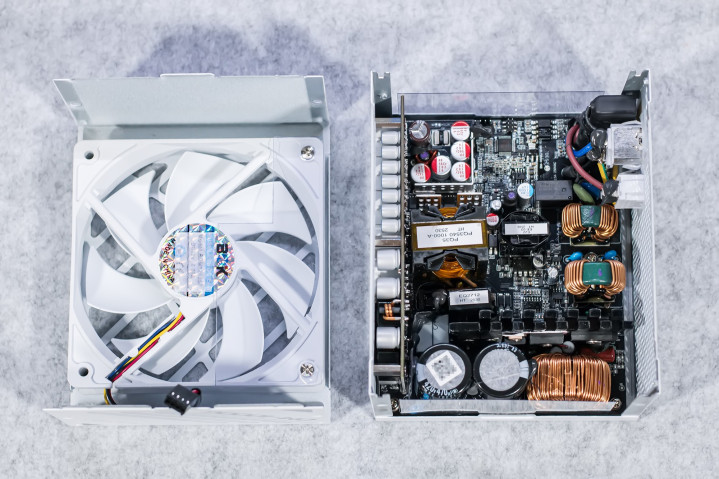 鑫谷数智DM-1000G冰山版电源采用主动式PFC+半桥LLC+同步整流+DC-DC架构,接下来对其进行适度拆解,主要是查看内部的布局设计与元器件型号,毕竟还需进行实际装机测试,电源内置一个白色直径12cm液态轴承散热风扇,生产厂商为宝凯迪,型号为BDM12025F,输入规格为12V/0.2A,风扇采用常见4Pin供电接口。