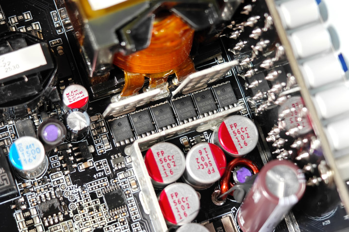 在变压器下方为+12V同步整流部分,配备了六颗同步整流管,三颗并联为一组,型号为平伟的PWC012N04ES,具体规格为40V/220A/1.0mΩ,在同步整流管两侧均设有散热片,并配置有五颗来自尼吉康的固态电容和一颗来自贵弥功的电解电容(16V/3300μF),还有一颗滤波电感。