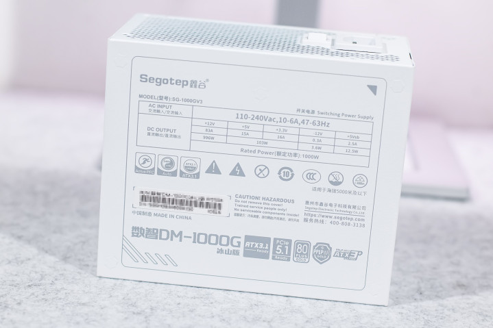 底部印有电源的各项技术指标与参数规格,电源支持110~240V电压范围与47~63Hz频率范围输入,额定输出功率为1000W,其中+12V的额定输出电流为83A,功率为996W,+5V与+3.3V的额定输出功率为103W,还有PCIe5.1标准、ATX3.1标准与80PLUS金牌认证等标识。