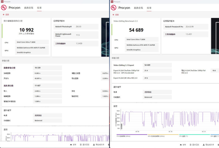 UL Procyon基准性能测试套件,实测照片编辑基准测试项目中的成绩为10992分,在视频编辑测试项目中(开启GPU加速)的成绩为54689分。