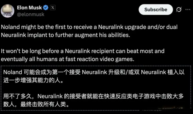 马斯克近日在社交媒体上再次引爆话题:他透露,Noland可能将成为第一个接受Neuralink “双芯片升级”的人,并大胆预测——“未来在动作游戏中,Neuralink用户会击败大多数人,最终击败所有人。” 这一言论让科技圈沸腾,也让电竞圈感到前所未有的震撼。
